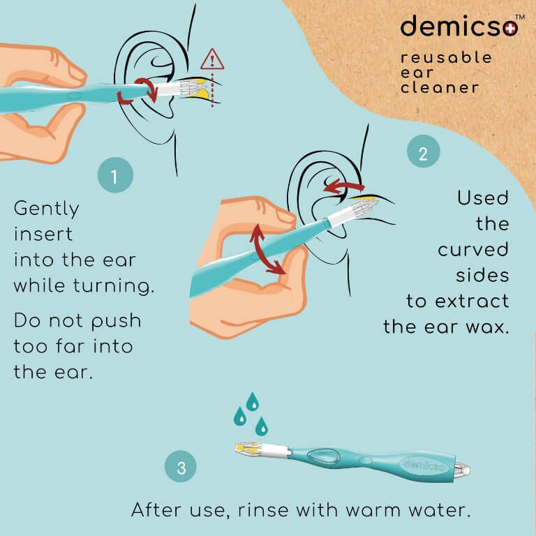 Demicso operates through a patented system and intelligent design. Its flexible head and double curved sides are specifically designed to «grab» excess earwax and remove it from the ear.’gently pull outwards the ear canal. Unlike a cotton bud, its grooved shape prevents wax from being pushed back towards the inside of the ear, ensuring optimal cleaning.