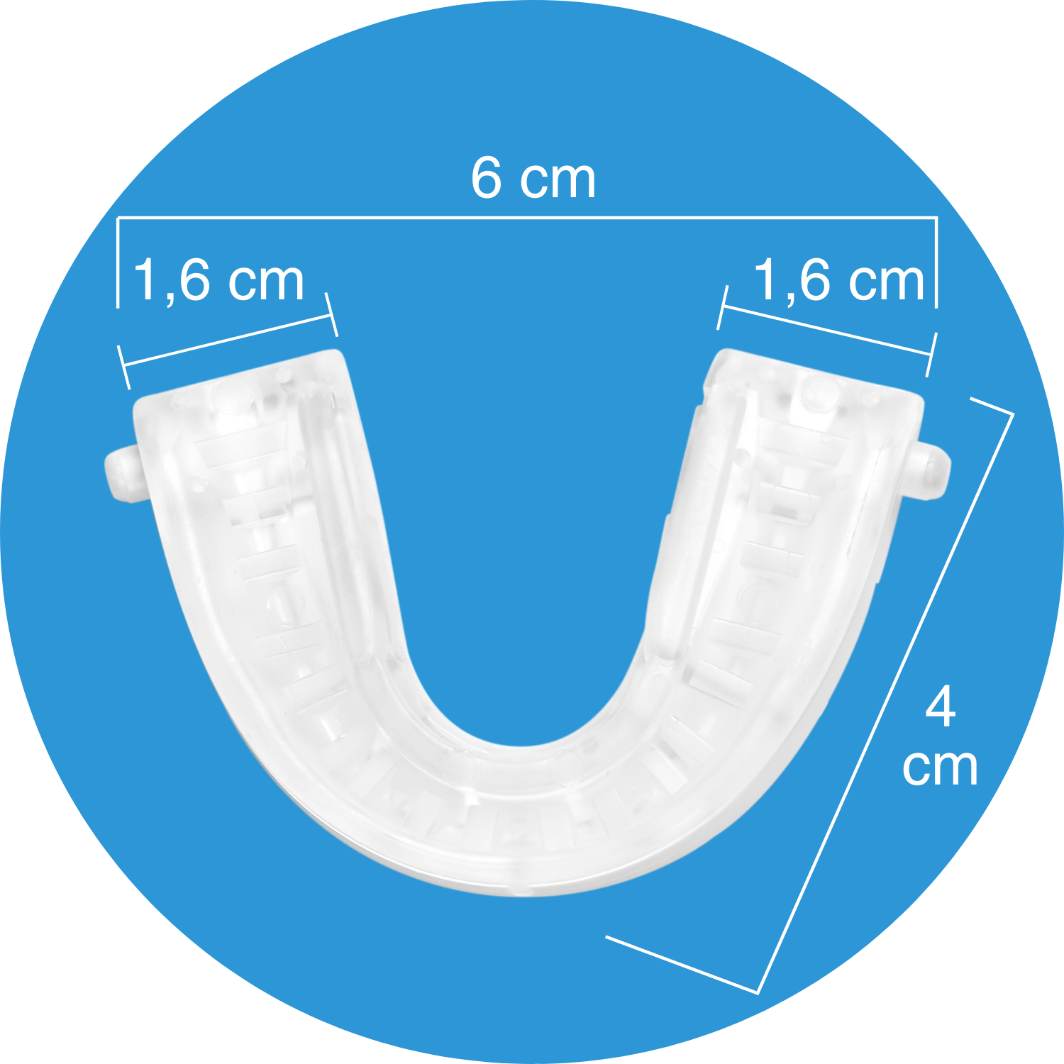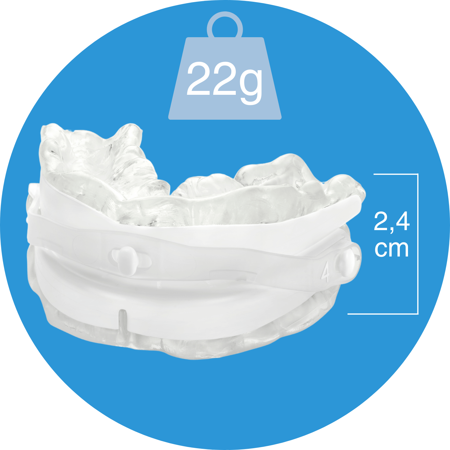 Les deux gouttières buccales (arcades supérieure et inférieure) sont reliées par un système de bandes synthétiques interchangeables. Celles-ci sont fournies en 8 différentes tailles qui permettent un ajustement optimal de l’avancement de la mâchoire inférieure en fonction de la dentition de l’utilisateur.