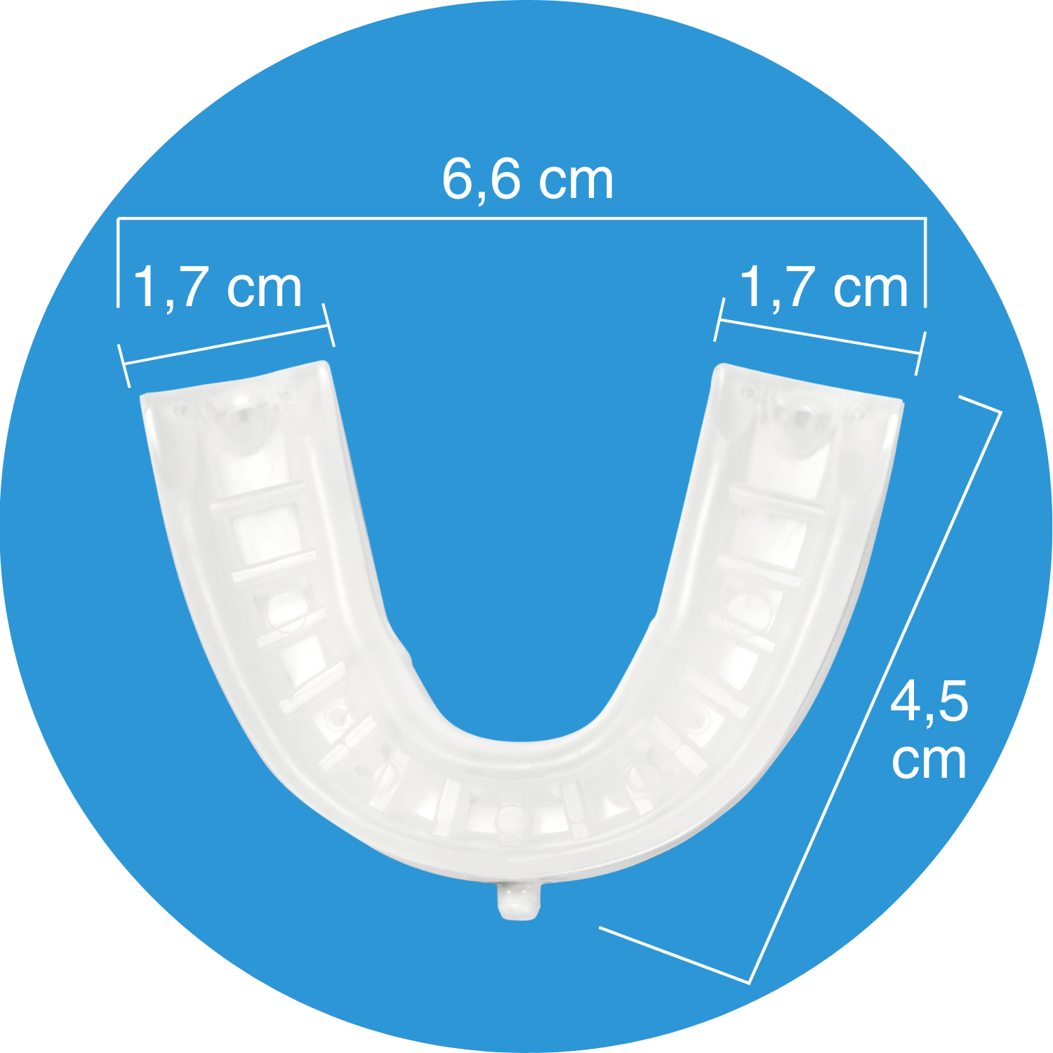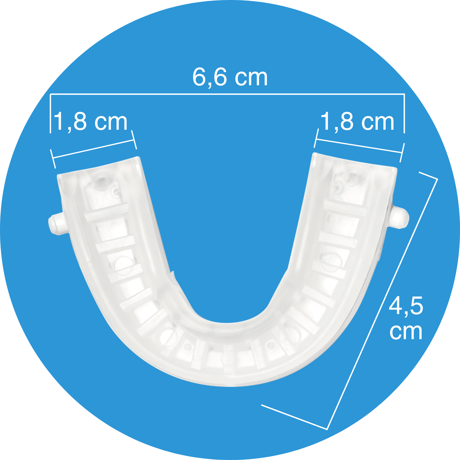 L’orthèse anti-ronflement possède une structure innovante qui permet une adaptation optimale de la gouttière à la largeur de la mâchoire. Grâce à sa flexibilité, elle offre un confort unique pendant le sommeil. Pour les personnes ayant une mâchoire de taille standard (S,M,L), nous proposons également le modèle SomnoFit-S, doté de la même technologie.