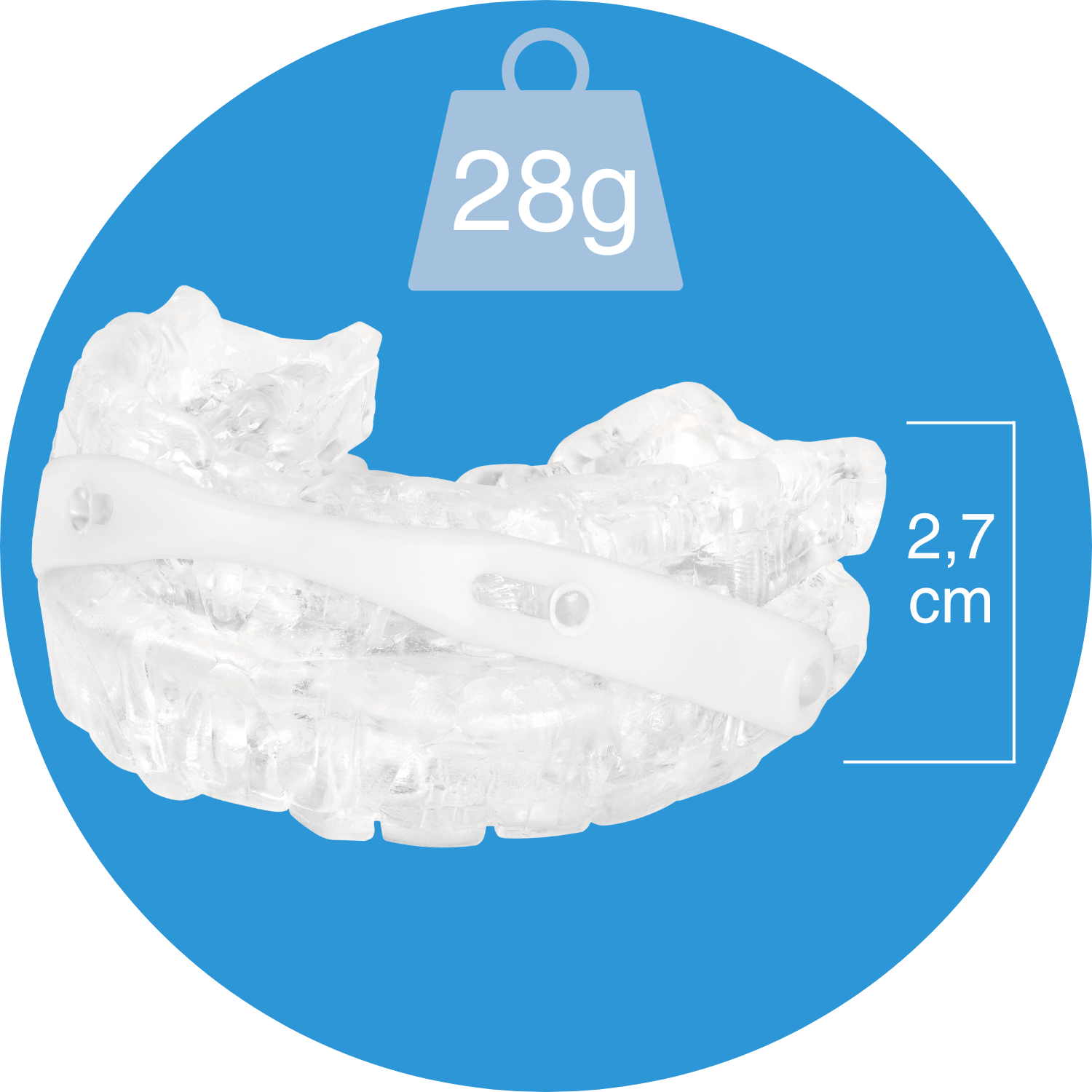 Les deux gouttières buccales (arcades supérieure et inférieure) sont reliées par un système de bandes synthétiques interchangeables. Celles-ci sont fournies en 8 différentes tailles qui permettent un ajustement optimal de l’avancement de la mâchoire inférieure en fonction de la dentition de l’utilisateur.